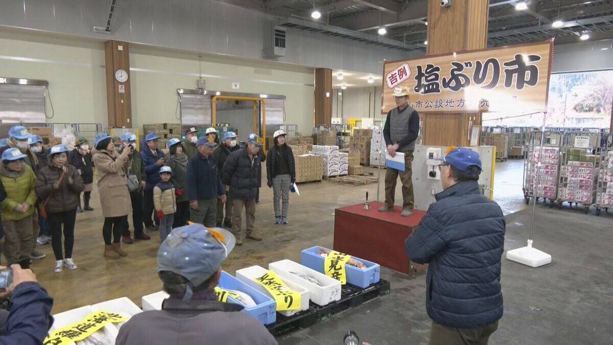 午前8時から始まった「塩ぶり市」では富山や石川で獲れたぶりを使った塩ぶり8本が並び、威勢のいいかけ声とともに次々と競り落とされていきました。