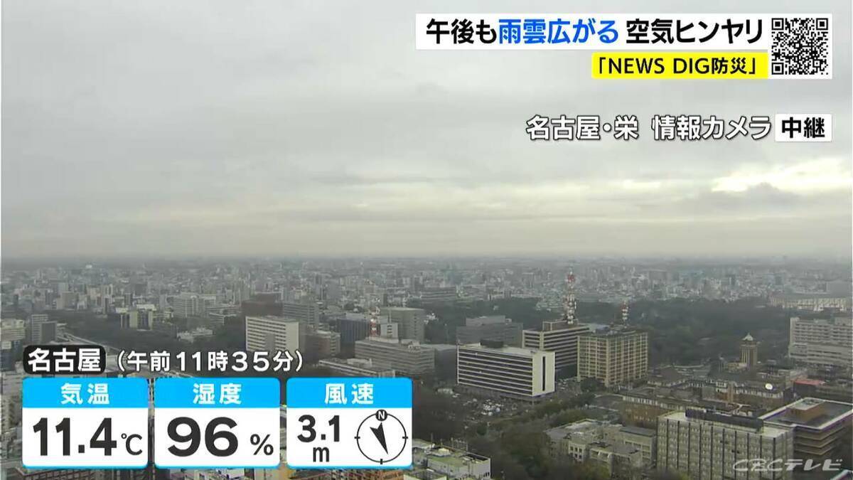 きょうは午後も雨の降る所が多いでしょう。最高気温は名古屋や岐阜、津で13℃の予想です。平年より気温は高くなるものの、日差しが届かず空気はヒンヤリとするでしょう。