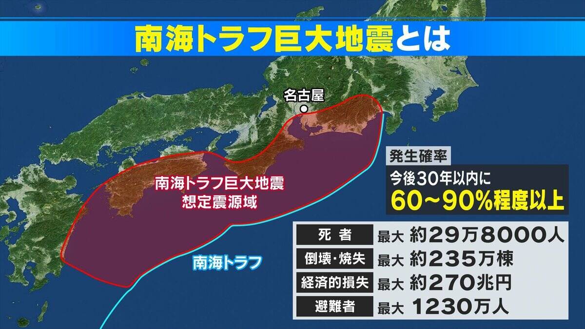 南海トラフ沿いでは今後30年以内にマグニチュード8から9の巨大地震が「60から90%程度以上」の確率で起きると予測されています。最大震度は7。太平洋沿岸の広い地域で10メートル以上の大津波が来ることが想定され、死者は最大で29万8000人にのぼる想定です。