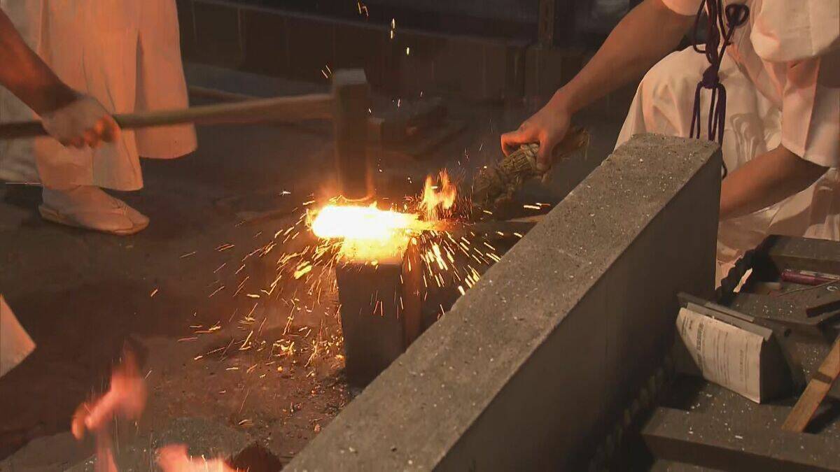 烏帽子に白装束姿の刀匠が、昔ながらの方法で火を起こした後、真っ赤に熱せられた玉鋼に大槌を振ると、会場には澄んだ音が響きわたりました。