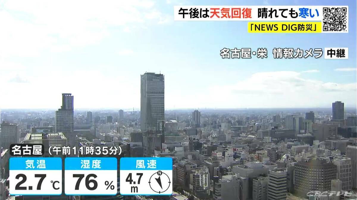 名古屋市内は、朝は雲が広がり雪が降っていましたが、正午前は晴れています。