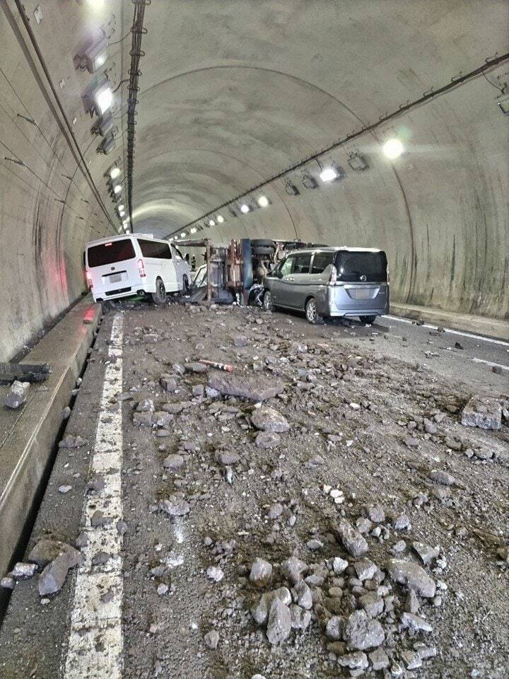 警察によりますと現場はトンネルの入り口近くで土砂のようなものを運んでいたトラックが横転し、散乱した積み荷に後続車両がぶつかったり、乗り上げたりしてトラックを含めてあわせて5台が絡む事故になりました。ケガ人はいないと言うことです。