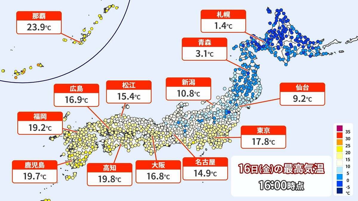 16日(金)は、この時期としては暖かい空気が入り、西日本から東日本では、最高気温が20℃近くまで達し、3月~4月並みの陽気になり”春先取り”となりました。