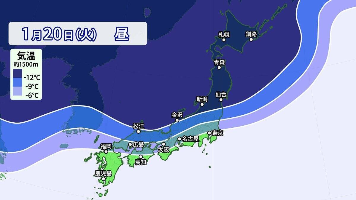 21日(水)には、東京、大阪、名古屋、広島、福岡付近まで-9℃以下というさらに強い寒気が流れ込みます。雪雲の流れ込み次第では、大雪になるおそれがあり、交通に影響が出てもおかしくありません。