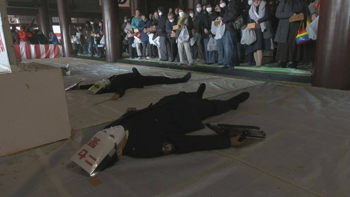 ことしは鬼にまじって岡崎警察署の署員が扮した偽警察官と偽投資家が登場し、「鬼は外」のかけ声に合わせ参拝者が一斉に豆を投げつけました。