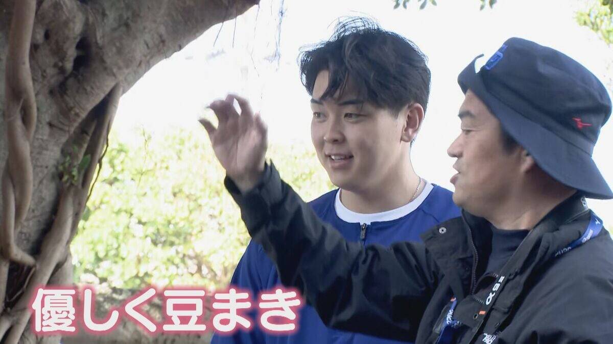 2月1日から沖縄でキャンプに励んでいるドラゴンズも豆まきです。鬼のお面をつけたドアラに、ドラフト1位ルーキー中西聖輝投手が豆を投げます!