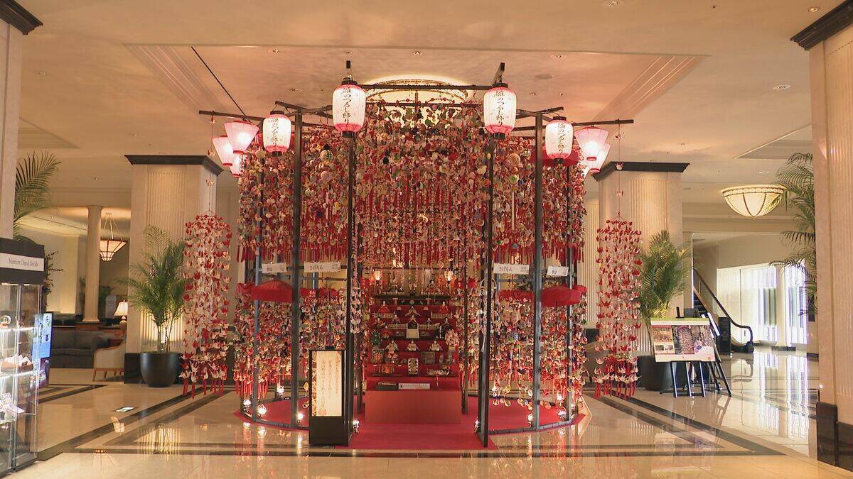 名古屋のホテルで、毎年恒例の雛のつるし飾りが展示されています。