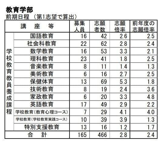 教育学部全体の志願倍率は2.8倍、医学部医学科は4.3倍、応用生物科学部の生物圏環境学科は2.8倍、共同獣医学科は4.6倍などとなっています。