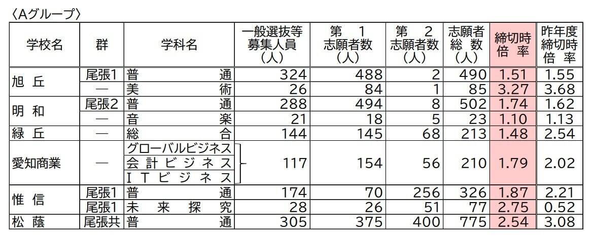 普通科で最も倍率が高かったのは、豊丘高校の3.52倍、次いで天白高校の3.16倍、瑞陵高校の3.14倍。