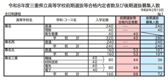 三重県教育委員会は、ことし(2026年度)の公立高校の前期選抜などの合格内定者数および後期選抜の募集人数を発表しました。