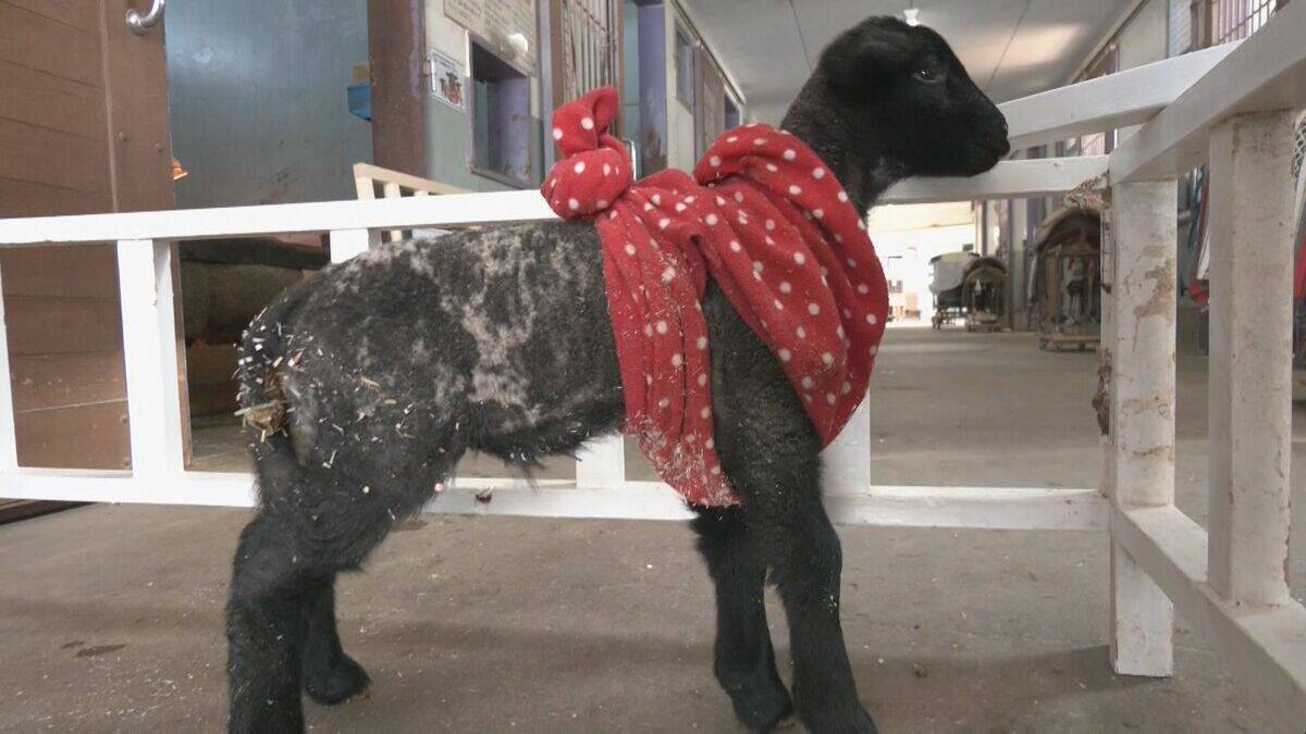 真っ黒な体に防寒用の服を着た羊の赤ちゃん。
