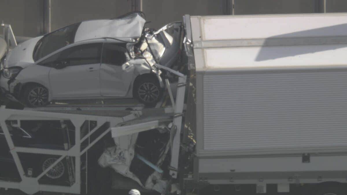 警察によりますと、きょう午後0時半すぎ、愛知県豊明市の伊勢湾岸道下り線で、キャリアカーが、渋滞でとまっていた車の列に突っ込み、合わせて4台が絡む玉突き事故がありました。