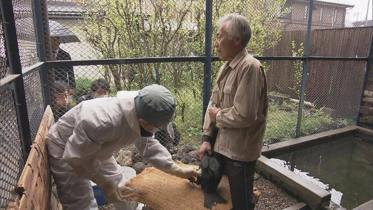 鵜匠代表の杉山雅彦さんの家では、一羽ずつ興奮する鵜を落ち着かせながら獣医師が伝染病を防ぐワクチンを接種しました。