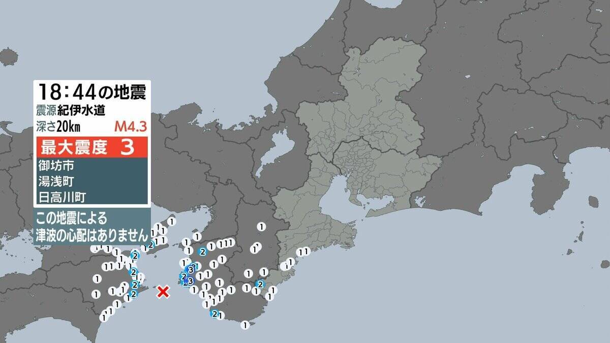 最大震度3を観測したのは、和歌山県の御坊市と湯浅町、それに日高川町です。