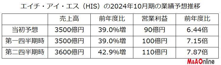 HISの中期経営計画では、2024年10月期に売上高3500億円(前年度比39.0%増)、営業利益90億円(同6.44倍)を目標に掲げた。