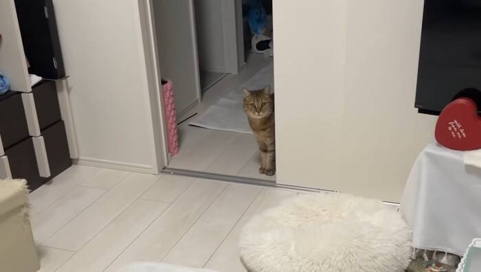 更にみにらくんは、もう一度スタンバイ。みにらくんは飼い主さんが見る度に止まり、少しずつ近づいてきていたそう。驚くほどちゃんとだるまさんがころんだができています。しかも狩猟本能が刺激されているのか、まんまるの目で見つめてくる姿が可愛すぎてたまりません。そんなみにらくんをまた見ると…。