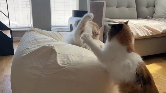 そして、うなぎちゃんとこたつくんのニャンプロは場外での追いかけっこへと発展してしまい、二匹の激しさに飼い主さんも思わず悲鳴をあげてしまったと言います。