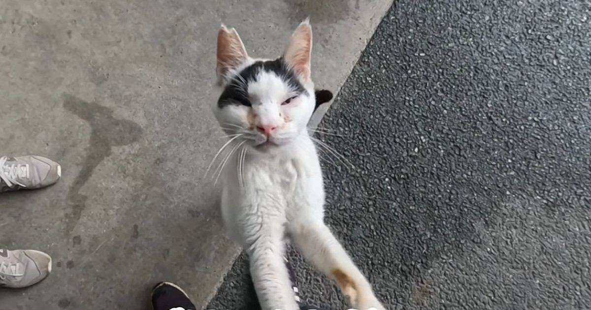 飲み物を買うために訪れたスーパーの入り口で出会ったのは、ガリガリに痩せて目ヤニがびっしりとついた野良猫。必死にしがみついてきた猫を保護した様子を収めた動画は、記事執筆時点で60万回再生を超え、「見てると涙出るわ」「お外で辛かったね。