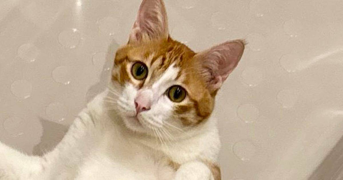 この日、飼い主さんがふとお風呂場をのぞいてみられたところ、猫ちゃんがバスタブの中でごろんと仰向けに寝そべっていたのだそうです。飼い主さんと目が合った瞬間、「何がいけないのかわからない」とでも言いたげな様子の“きょとん顔”を披露してくれたのだとか。