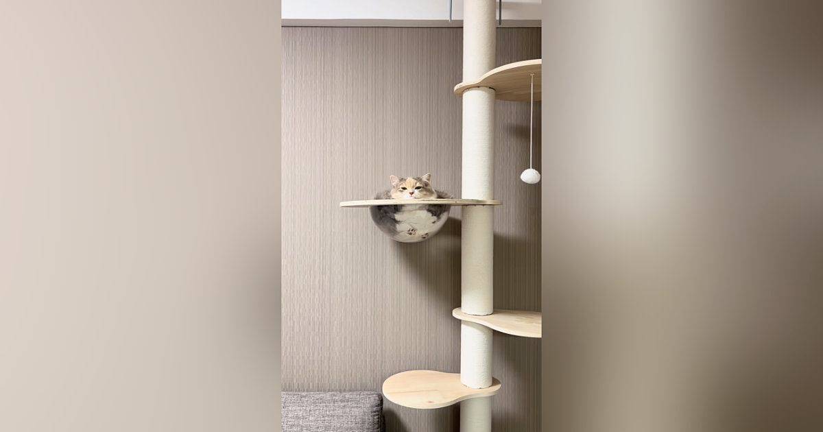飼い主さんがふとキャットタワーを見てみると、猫さんがくつろいでいたのですが…。まさに「猫は液体」という言葉がピッタリな、意外すぎる姿が目に飛び込んできたそうです。