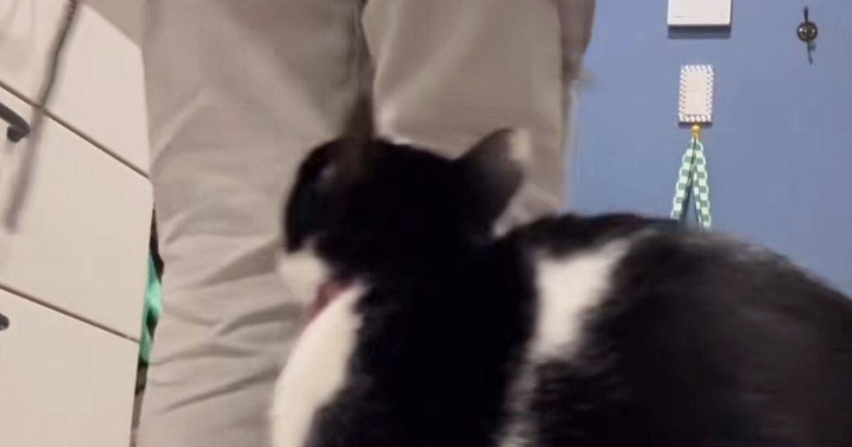 エプロンを装着している飼い主さんの足元には、何やら意味ありげにウロウロする猫さん。動きを止めてロックオンした後、背中めがけてジャンプすると…?