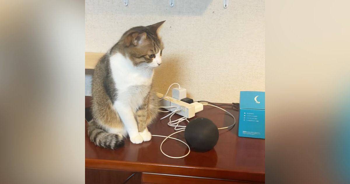 スマートスピーカーから聞こえてくる猫の鳴き声に驚く保護猫のシンちゃん。その後の予想外の展開が面白いと話題を呼んでいます。