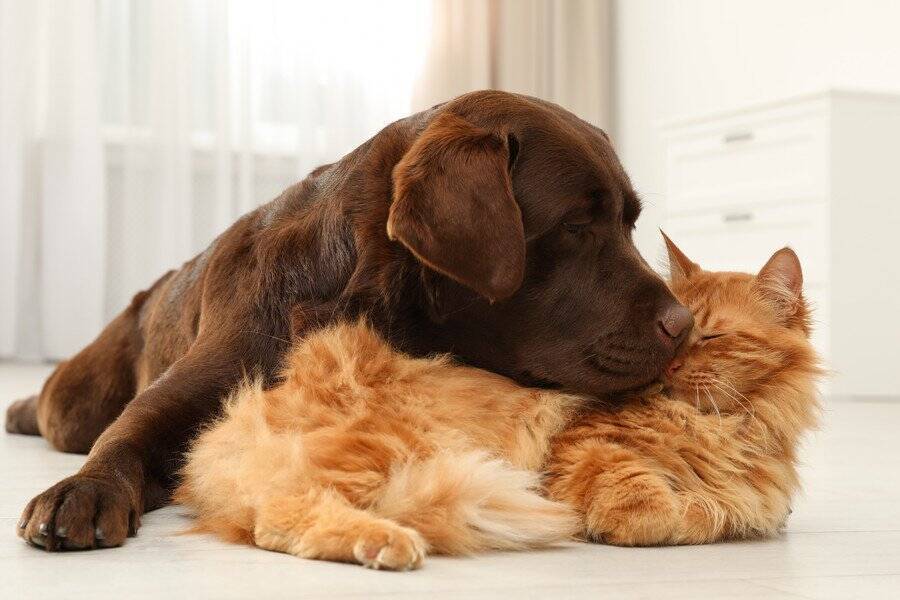 年老いた猫を、犬がグルーミング