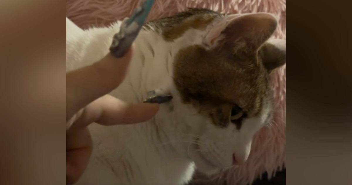 ある日、まったりとしていたふたばくんのほっぺたの近くに、長さ出しをしたネイルを差し込んでみたという飼い主さん。すると、刺した部分の毛に小さな穴が空いたのだそう。面白くなった飼い主さんは、ふたばくんに横目でじっと見られていることにも気付かず、2個、3個と穴を増やしていったといいます。