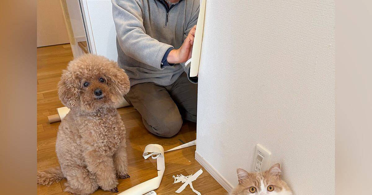 Xアカウント『トイプードルPoochinとミヌエットKiki』に投稿された光景が、たくさんの人に笑顔を届けることとなりました。その投稿に映っていたのは、破れた壁紙を補修する飼い主さんと、飼い主さんのそばでくつろぐミヌエットのキキくんとトイプードルのプーチンくんの姿。