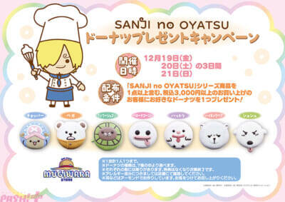 2025年12月19日(金)、20日(土)、21日(日)の期間、「SANJI no OYATSU」シリーズの商品を一点以上含む、3,000円以上(税込)お買い上げのお客様に好きなドーナツを1会計につき1つプレゼント。ぜひ、期間中は「ONE PIECE MUGIWARA STORE HARAJUKU」に遊びにきてくださいね♪