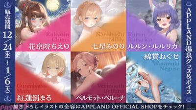 「.LIVE」より花京院ちえり、七星みりり、ルルン・ルルリカ、「ぶいぱい」より紅蓮罰まる、ベルモット・ベルーナ、綿貫ねぐせの描き下ろしイラストを使用した『APPLAND温泉グッズ』が公式グッズ販売サイト(APPLAND OFFICIAL SHOP)にて2025年12月24日(水)より販売。