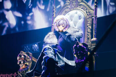 黒龍がオーディエンスを王城へ誘うオープニング映像により、一気に場内は神聖な雰囲気に。スクリーンのなかの初兎に目を奪われていると、舞台上に3次元の本人が登場した。玉座に堂々と腰をかけながら、ライブリード曲である「EreboSs」をドロップ。柔らかさと鋭さを巧みに使いわけ、『LAST EDEN』の世界観を描きだしていく。