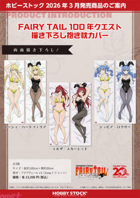 TVアニメ『FAIRY TAIL 100 年クエスト』から、描き下ろしイラストを使用した抱き枕カバーが登場! 表面は水着姿、裏面はバニースーツ姿と両面で異なるシチュエーションを楽しめます。生地はきめ細やかな質感が特徴の「アクアヴェール v3(2way トリコット)」を使用しています。