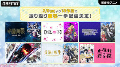 ABEMAは、2026年2月9日週に現在放送中の新作冬アニメ18作品の無料振り返り一挙放送を実施します。