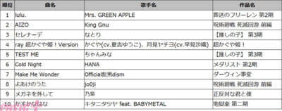 日本を代表するJ-POPシーンのビッグネームたちがアニメ主題歌を主戦場に激しいバトルを繰り広げているような、すさまじく豪華なランキングである。1位は名実ともに現在のJ-POPシーンを牽引するMrs. GREEN APPLEが担当した『葬送のフリーレン 第2期』オープニングテーマ「lulu.」、そして2位は『呪術廻戦』との濃密なコラボレーションを繰り広げてきたKing Gnu「AIZO」。Mrs. GREEN APPLEはもはや【国民的人気×覇権アニメの続編主題歌】という“鬼に金棒”状態のため当然の結果と言えるが、「AIZO」はKing Gnuらしからぬアニソン的な疾走感とサビのパワフルなポップネスがカラオケでウケている要因ではないだろうか。