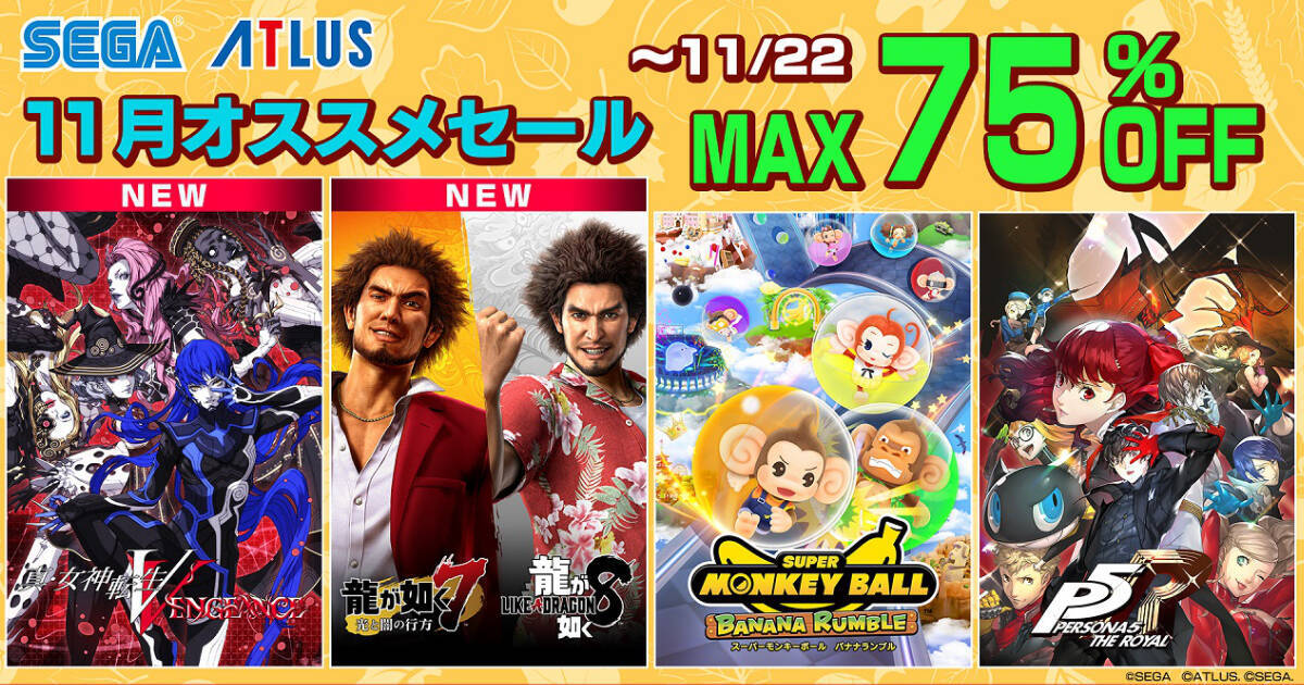 「真・女神転生V Vengeance」や「ペルソナ5 ザ・ロイヤル」、「スーパーモンキーボール バナナランブル」などがセール対象となっています。