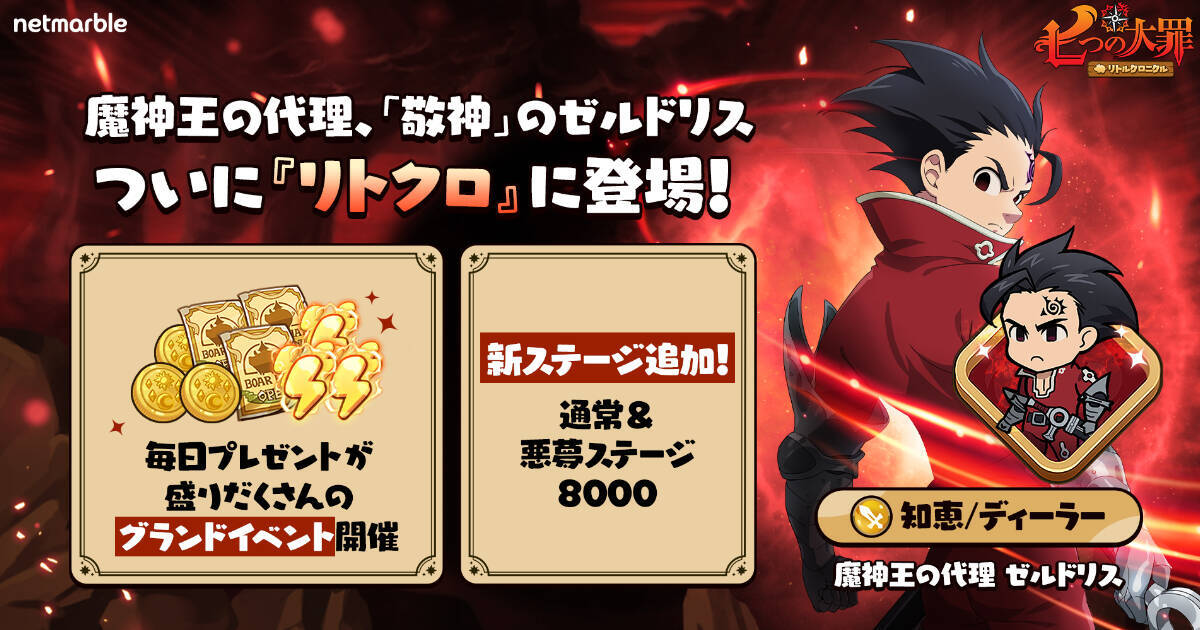 2024年12月30日(月)、スマホカジュアルRPG「七つの大罪~リトルクロニクル~」にアップデートが行われ、新レジェンドキャラ「魔神王の代理 ゼルドリス」や新ステージなどが追加されました。