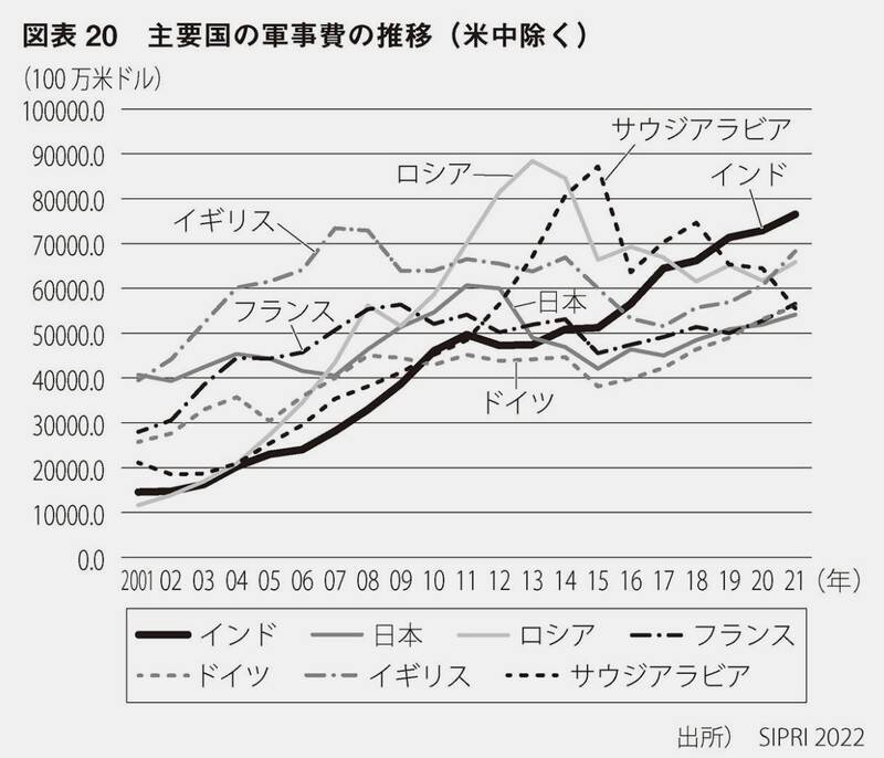 図表20 主要国の軍事費の推移(米中除く)。『インドの正体-「未来の大国」の虚と実』より