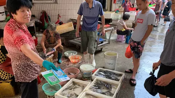 「ウィーチャットペイ」と「アリペイ」、2つのQRコードを見せる店員 中国の生鮮市場にて