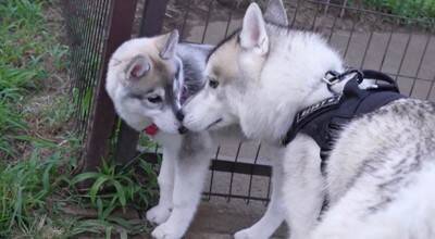 こちらは、兄ハスキーのフィン君。ドッグランで出会ったパピーにご挨拶!成犬のフィン君とパピーの体の大きさの違いがよくわかりますね!