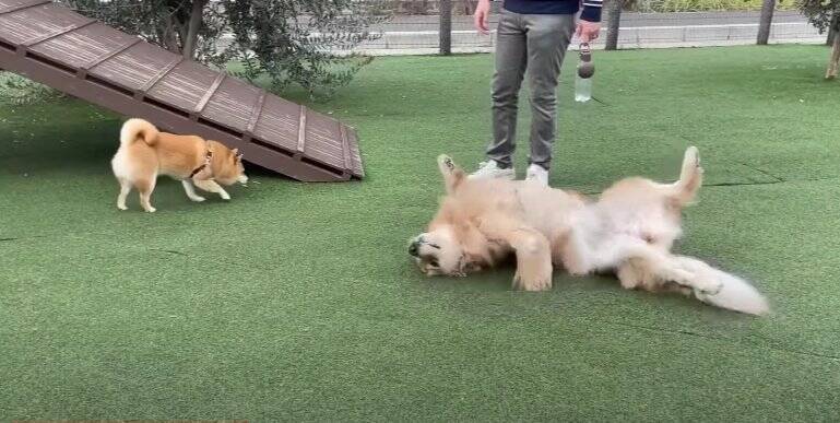 ゴールデンレトリバーのおからちゃんと豆柴のうにくん。今日はホームセンターのドッグランへお出かけ♪ルンルン気分で駆け回り遊ぶおからちゃんとうにくん!利用時間が終わりなので、出ることを伝えると…逃走(笑)。