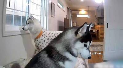 こちらは、兄ハスキーのフィン君と弟ハスキーのヴァル君。パパさんに頼まれてお留守番をしているのですが、ヴァル君は寂しくてしょんぼりしていますね。
