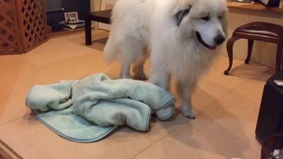 動画の主役は、グレートピレニーズのアランちゃん。この日アランちゃんは、縄張りだというお座敷でまったりくつろいでいたそう。アランちゃんの傍に敷かれたブランケットはお気に入りの一品です。