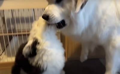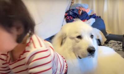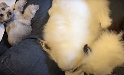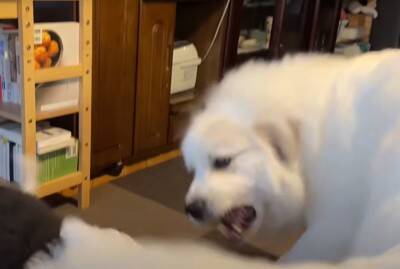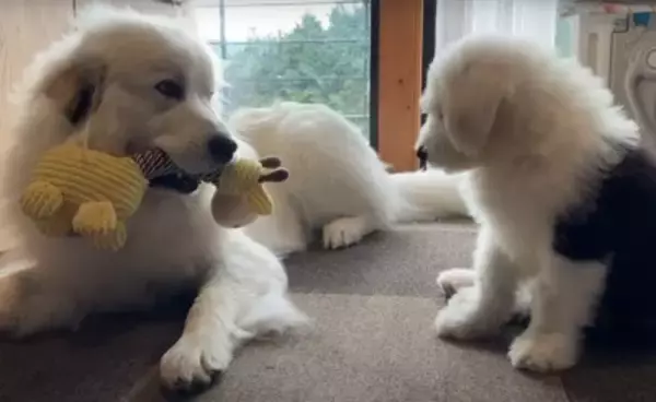 今回ご紹介する動画の主人公は、ふさふさした白い毛が特徴の大型犬「グレートピレニーズ」の『シュシュ』ちゃんです。山奥で暮らすシュシュちゃんが近ごろ手を焼いているのが、新入りの『むぅむぅ』くん。むぅむぅくんは「オールド・イングリッシュ・シープドッグ」という大型の犬種で、動画撮影時はまだ生後2ヶ月でした。