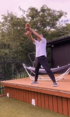 ラプトルちゃんの迎え入れにあたり、自宅のお庭で先住犬たちへ向けたお披露目会が開催されました。先住犬4匹が並んで座る中、ステージに見立てたウッドデッキに現れたのはご主人とラプトルちゃん。ご主人は仁王立ちでラプトルちゃんを高く掲げ、先住犬たちに子犬の顔を紹介したといいます。その光景はライオンキングのワンシーンを彷彿とさせるもので、何ともシュール。