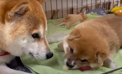 そんな親子のケージの外では、笑太郎くんの兄と姉である「茶太郎」くんと「ゆず」ちゃんがじゃれ始めていました。すでに成犬である茶太郎くん&ゆずちゃんのワンプロは大迫力。
