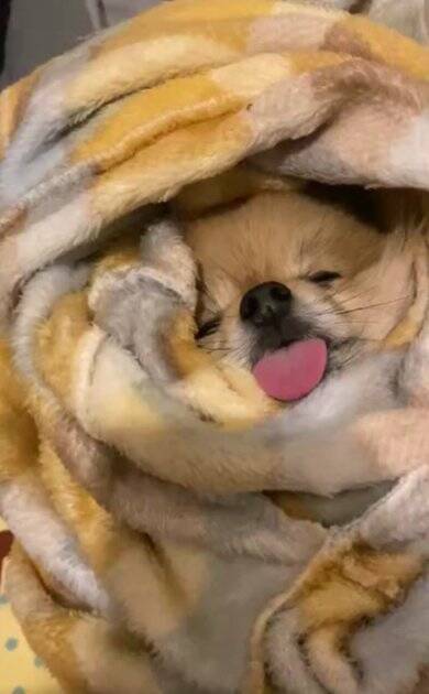Xアカウント『ぽめ』に投稿されたのは、ついつい『舌』が出っ放しになってしまいがちだというポメラニアン「もも」さんと飼い主さんの優しすぎる攻防。毛布に包まれながら気持ちよさそうに眠るももさんですが、可愛らしいピンクの舌が無防備にも出っ放しになってしまっていたのだそう。