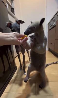 今回ご紹介する動画に登場するのは、イタリアングレーハウンドの「テオ」くんと、コアリクイの「パル」ちゃんです。この日パルちゃんは、飼い主さんにおやつの伊予柑をもらって食べていたのだそうです。2本足でしっかり立って伊予柑を食べるパルちゃんの隣には、伊予柑を横取りしようとぴったりマークするテオくんの姿が。