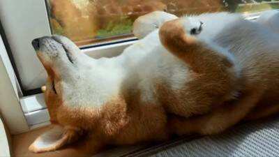 柴犬の「ゆき」ちゃんは、マイペースでおっとりした女の子。この日は、窓辺で気持ちよさそうにお昼寝中だったそう。仰向けでお腹を見せた「ヘソ天」でかなりリラックスしているご様子。