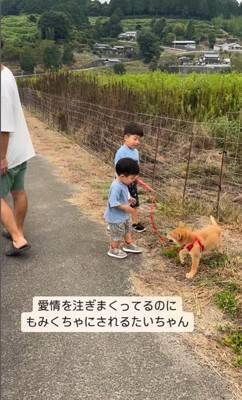 この投稿には「ももちゃんがたいちゃんの事大好きなのが分かりますね」「小さく『こりゃー』がたまらんw」「もみくちゃにされても泣かなくて強いぞ。偉いぞ」「倒されて振り返る時の表情に、燃える闘志を感じる。そして歩き出す時に『やれやれだぜ』感を感じますw」といったコメントが寄せられています。